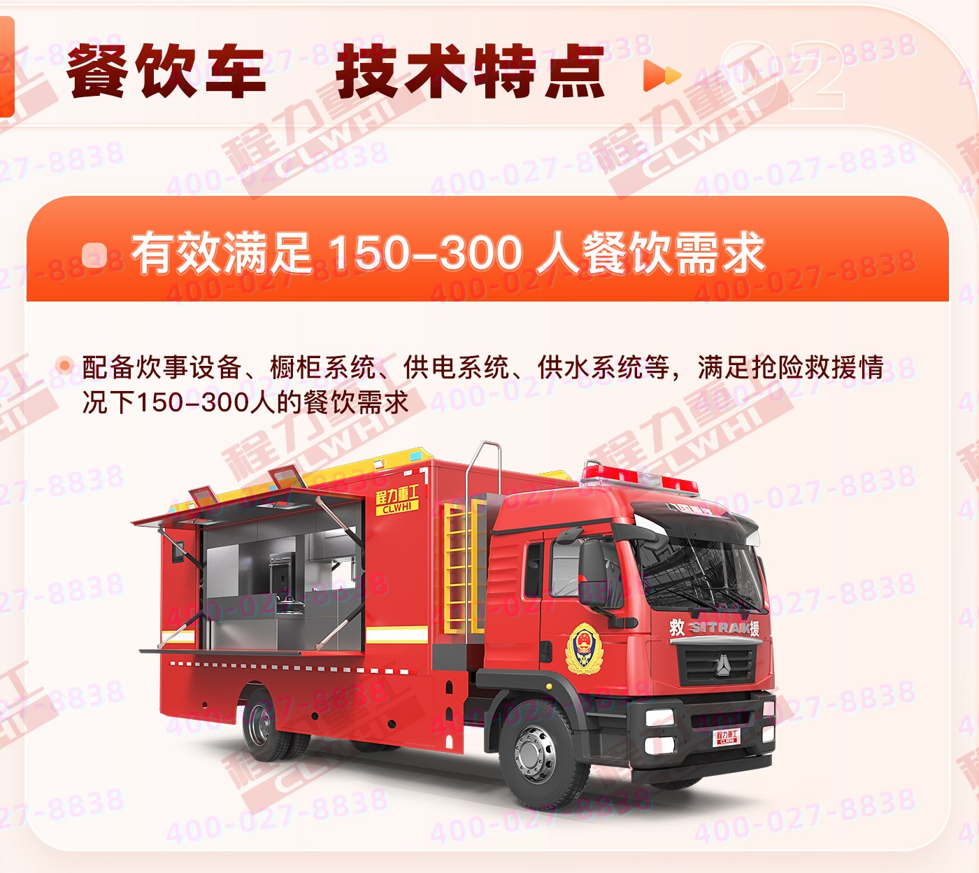 重汽HOWO炊事車:中國重型汽車集團(tuán)原廠重汽豪沃6*6越野底盤,三軸5200+1400mm軸距,9726ML排量,280馬力。