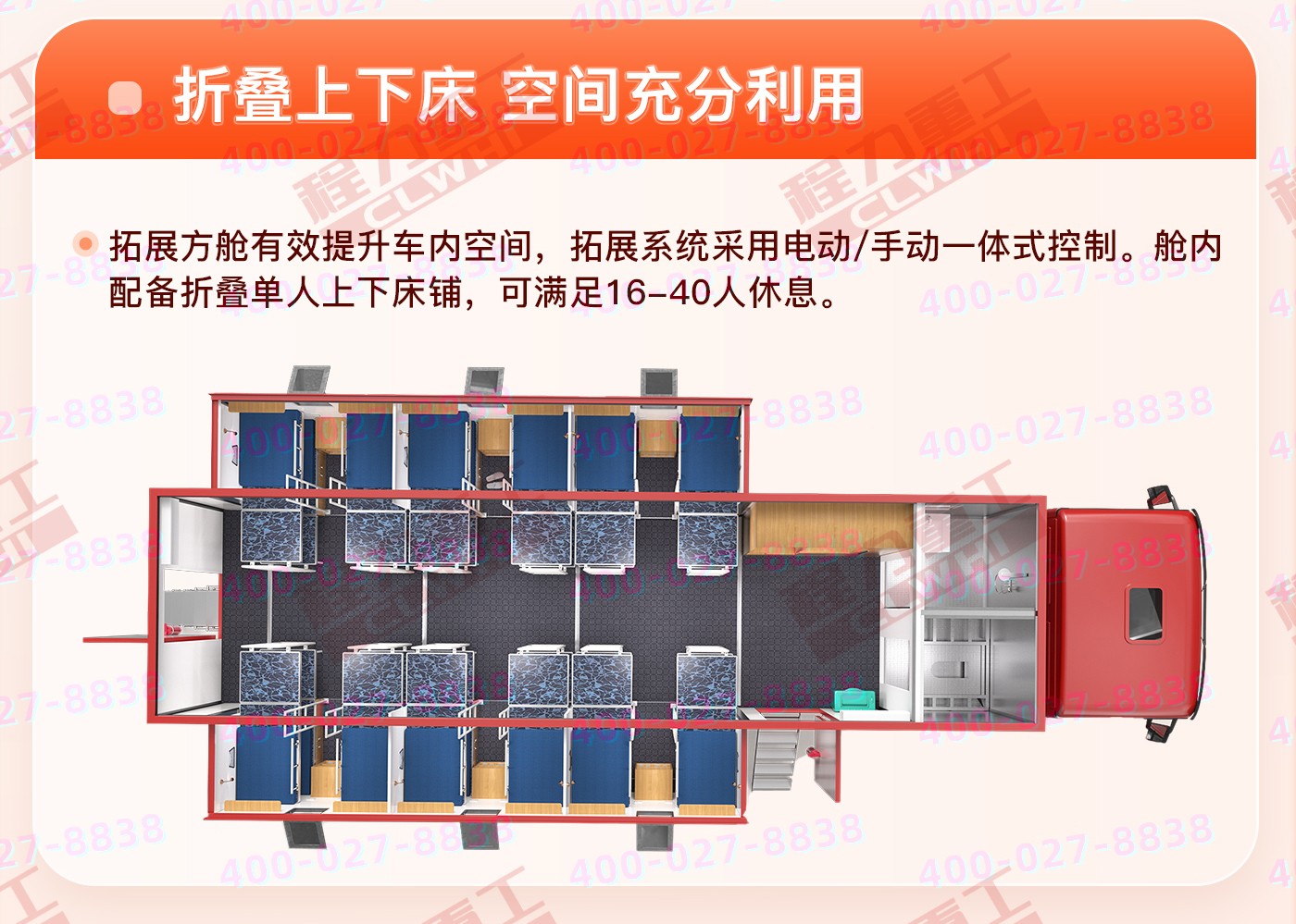 主要專用裝置發(fā)電機(jī),折疊床鋪等,選裝配置衛(wèi)浴間、凈水箱、外掛式空調(diào)、衛(wèi)星天線、吸頂電視、換氣扇、車廂左、右可選裝擴(kuò)展機(jī)構(gòu)箱體、車廂左、右兩側(cè)、后部增加或封閉窗戶、車門、車輛顏色可選裝裝有具有衛(wèi)星定位的行車記錄儀等,不擴(kuò)展可供8-12住宿,擴(kuò)展后可供20-24人住宿。(可根據(jù)客戶要求改裝)
