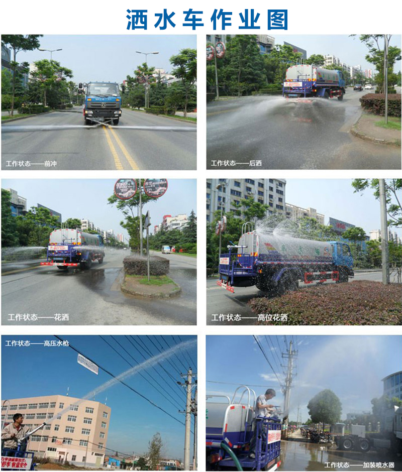 灑水車(chē)專(zhuān)用功能: 垂直吸程>6米,灑水寬度>14米,射程>28米。灑水車(chē)前沖(能將路面泥巴、塵土、垃圾沖干凈);后灑(能均勻地將水灑在路 面,一次灑水寬度>14米)、前側(cè)噴(花灑)(能均勻地將路旁綠化帶澆灌)、帶后工作平臺(tái),平臺(tái)上安裝綠化灑水高炮(炮有大雨、中雨、毛毛雨、霧狀 可調(diào)節(jié))。配備全國(guó)質(zhì)量領(lǐng)先的大功率專(zhuān)用灑水泵,引水時(shí)間 <5分鐘,流量 90立方/小時(shí) 。 帶消防接頭,帶自流閥,帶自吸功能。