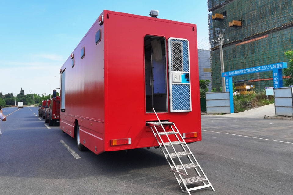 1、整車擴(kuò)展艙為更衣間,更衣間右外側(cè)設(shè)有門和門梯,撤收后門梯固定在主車廂下副梁中間,更衣間門口處設(shè)有門梯燈;廂體后端設(shè)有登頂梯,主車廂下設(shè)有擴(kuò)展機(jī)構(gòu),擴(kuò)展艙(更衣間)的展開和撤收由擴(kuò)展機(jī)構(gòu)實(shí)現(xiàn),撤收后有可靠的鎖緊機(jī)構(gòu)。設(shè)備間在廂體前端:內(nèi)部有燃油熱水鍋爐、2.8KVA柴油發(fā)電機(jī)、水泵、精密過濾器、暖風(fēng)機(jī)、滅火器、通風(fēng)窗、照明燈;淋浴間設(shè)置12個淋浴噴頭、U形不銹鋼水箱(淋浴間前端、右端、后端設(shè)置水箱)、皂盒、通風(fēng)窗、照明燈;更衣間為右側(cè)擴(kuò)展艙,內(nèi)設(shè)有更衣柜、衣帽鉤、照明燈、前端下部設(shè)有通風(fēng)進(jìn)氣門、后端上部設(shè)有換氣扇。